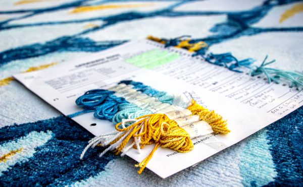 Colour reference cards such as the one shown here depicting the colours used to create ‘Nylon Engulfed’ – the prototype handknotted rug made from ECONYL® – are kept by rug makers to ensure not only consistency between individual carpets but as record of what as been made. | Photograph by Prabal Ratna Tuladhar.