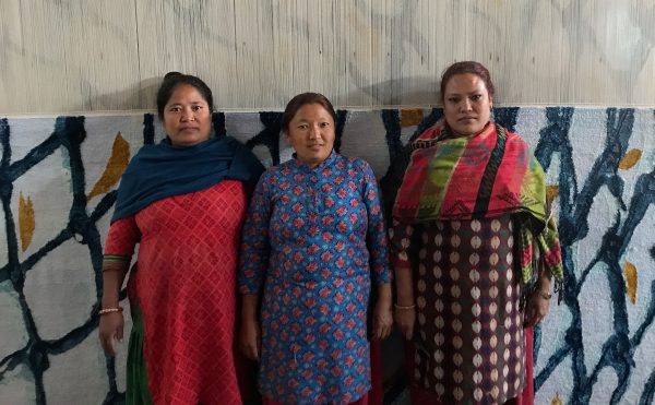 Weavers Kumari Rai, Paljung Sherpa, and Sun Maya Lama, (left to right) were tasked with weaving the first – the prototype – handknotted carpet made from ECONYL® regenerated nylon by Sarawagi Rugs. | Photograph by The Ruggist.